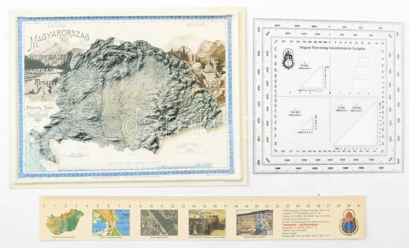 Magyarország hegyrajzi és vízrajzi térképe dombornyomott műanyag reprint 1:1 800 000 17x22 cm + Méretarány vonalszó MH Geosz + reklám vonalzó