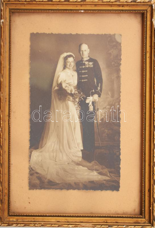 Katonatiszt kitüntetésekkel, esküvői fotón 10x14 cm Üvegezett keretben https://www.darabanth.com/de/479-Fernauktion/479.0/Kunst-Dokumente-andere-Sammelgebiete/Militaria~1000009/Katonatiszt-kituntetesekkel-eskuvoi-foton-10x14-cm-Uvegezett-keretben~II3271518