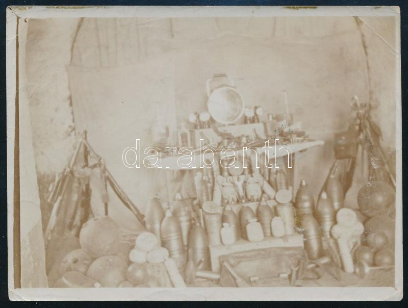 Beschreibung: cca 1915 "A mi lövegeink, fényszoro és ölő készülékek", I. világháborús fegyverraktár, a hátoldalon feliratozott fotó, 11,5x8,5 cm
