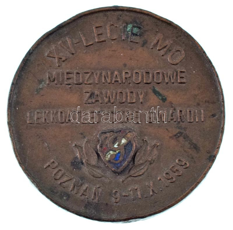 Lengyelország 1959. "XV. Nemzetközi Nyári Atlétikai Verseny Gwardii - Poznan 9-11.X.1959" egyoldalas bronz emlékérem rajta "G" műgyantás miniatűrrel (41mm) T:VF, peremhiba, patina
