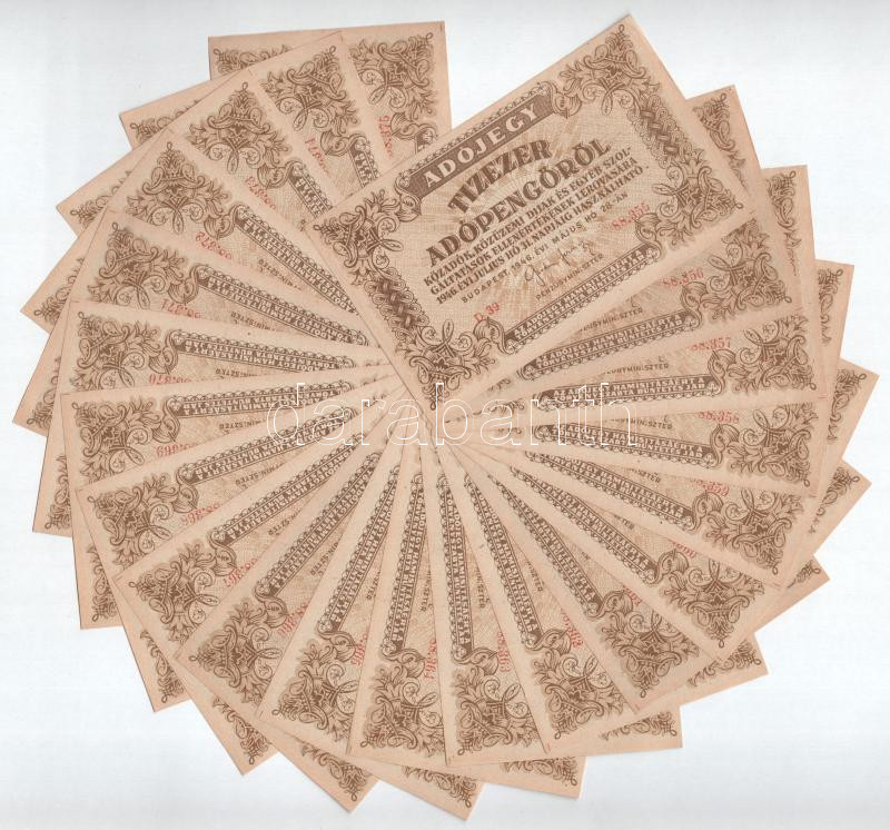 Beschreibung: 1946. 10.000AP (21x) sorszámkövetők, vízjeles papíron "D39 88.355 - D39 88.375" T:AU