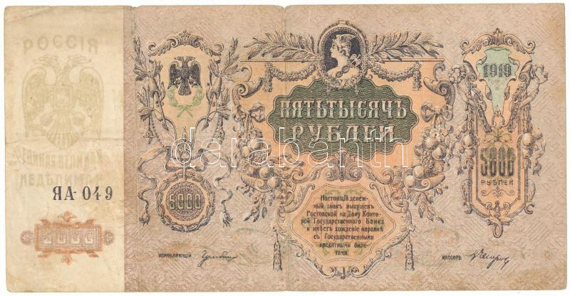Russian Civil War / South Russia / Army of Denikin and Wrangel 1919. 5000 Roubles C:F small material missing at the folds