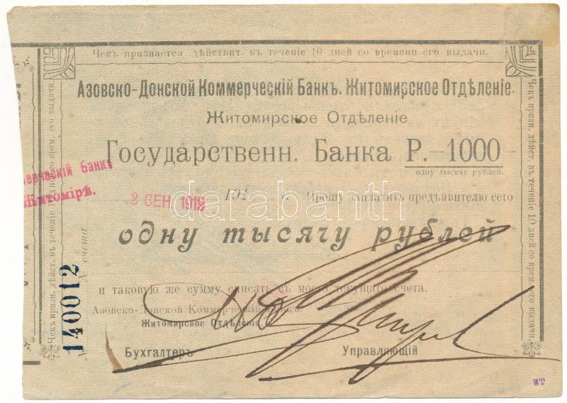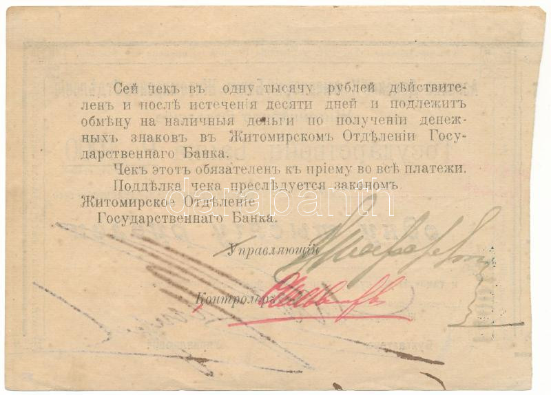 Orosz Polgárháború / Ukrajna és Krím / Zsitomir 1919. 1000R felülbélyegzéssel, aláírásokkal T:XF-VF