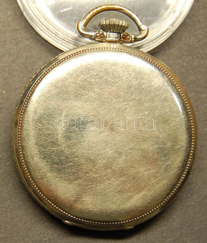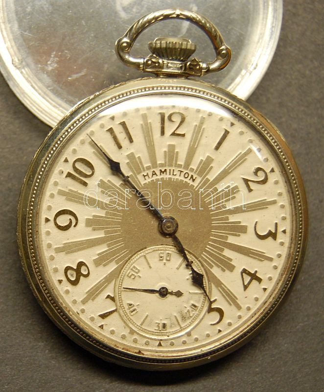 HAMILTON (USA) aranyozott zsebóra 14K-os fehérarany, ill. aranyozott, 58,3g. Átmérő: 44mm. Kb. 1930-as évekből, kitűnő, pontos, tisztított szerkezet, hibátlan külső.