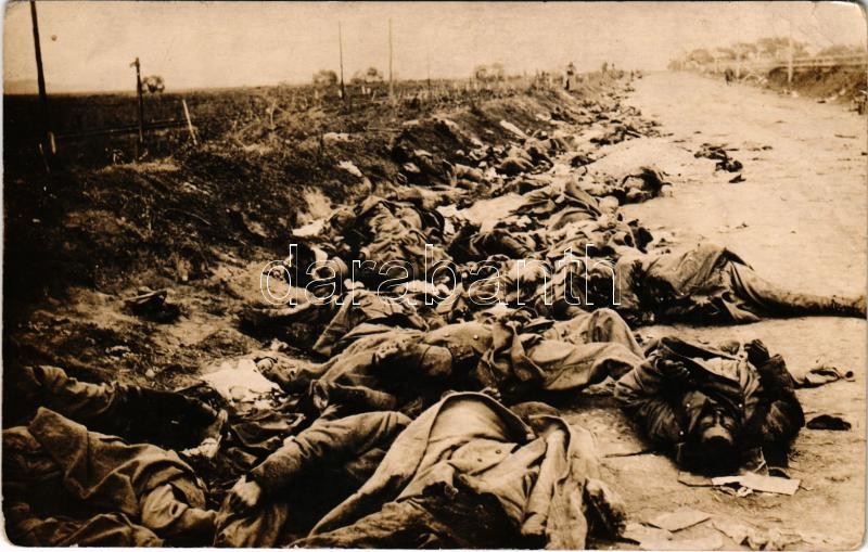 Brassó, Kronstadt, Brasov; Die Befreiung Kronstadts, Bei Bartholomä 8. Okt. 1916. / Brassó felszabadítása, halálrajvonal csata, halott oláh katonák rajvonala a bertalani és brassói vasútállomás között / WWI entry of the German troops, dead Vlach soldiers between the railway stations of Bartolomeu and Brasov. H. Lang photo (EB)