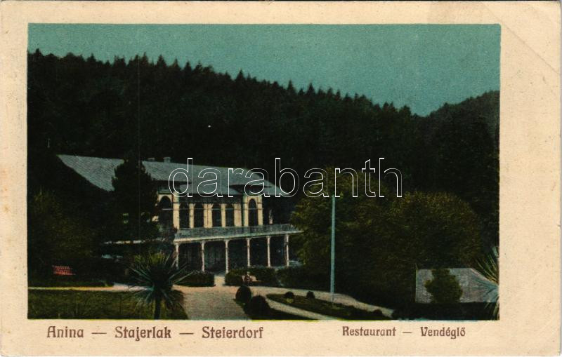 Stájerlakanina, Steierdorf, Anina; Vendéglő, étterem / restaurant (EK) https://www.darabanth.com/de/480-Fernauktion/480.0/Ansichtskarten/Siebenburgen~1000006/Stajerlakanina-Steierdorf-Anina-Vendeglo-etterem-restaurant-EK~II3281057