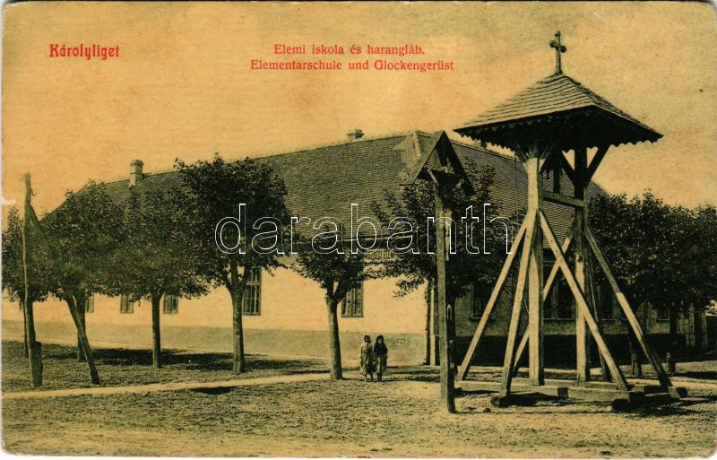 Károlyliget, Charleville (Bánátnagyfalu, Banatsko Veliko Selo - 1920-ig Zsombolyai járáshoz tartozott); Elemi iskola és harangláb. W. L. 1366. / school, belfry (fl)