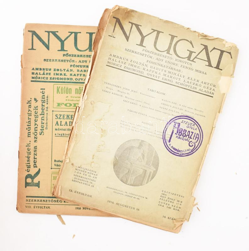 1912 Nyugat 2 száma: IX. évf. 16., és 22. számok. 1916. aug. 16., és nov. 16. Főszerk.: Ignotus. Szerk.: Ady Endre, Fenyő Miksa. Papírkötések, viseltes, sérült, széteső állapotban. Restaurálásra szorulnak. A 22. szám borítóján nyomdahibás számozással (VIII évf. a IX. évf. helyett), a 16. szám borítóján: "Steuer Gyula Abbazia Kávéház" bélyegzésével.