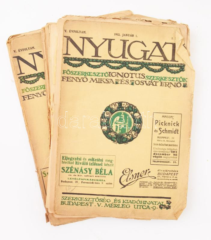 1912 Nyugat 2 száma: V. évf. 1. és 8. számok. 1912. jan. 1., és árpili... https://www.darabanth.com/de/480-Fernauktion/480.0/Bucher/Bucher-Andere-kuriositaten~2000031/1912-Nyugat-2-szama-V-evf-1-es-8-szamok-1912-jan-1-es-arpilis-16-Foszerk-Ignotus~II3280112