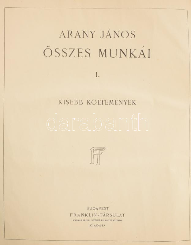 Arany János összes munkái. I., IV., V. köt. (I.: Kisebb költemények. IV.: Aristophanes vígjátékai. V.: Prózai dolgozatok. ) Bp., é.n. (cca 1900-1910), Franklin-Társulat. Kiadói aranyozott egészvászon sorozatkötés, változó állapotban, az I. kötet gerincén kisebb sérüléssel, néhány kijáró lappal.