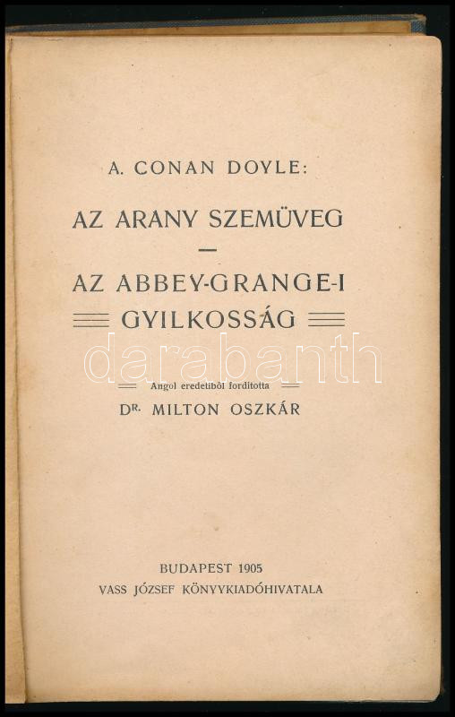 Arthur Conan Doyle: Az arany szemüveg. Az Abbey-Grange-i gyilkosság. Ford.: Milton Oszkár. Bp., 1905, Vass József (Révai és Salamon-ny.), 107+(5) p. Kiadói szecessziós egészvászon-kötés, kissé viseltes, kopottas, foltos borítóval, helyenként foltos lapokkall