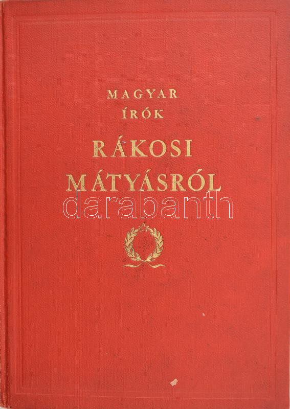 Magyar írók Rákosi Mátyásról. "Rákosi Mátyásnak, népünk szeretett vezérének, hatvanadik születésnapjára: a magyar írók." (Bp.),1952, Szépirodalmi, 335 p. Benne Zelk Zoltán, Veres Péter, Örkény István, Illyés Gyula, Déry Tibor, Devecseri Gábor, Darvas József, Nagy László és mások írásaival. Kiadói aranyozott vörös egészvászon-kötés.