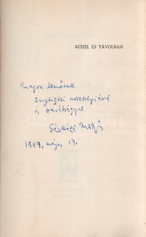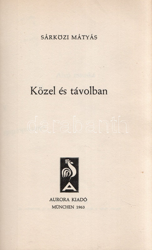 Sárközi Mátyás: Közel és távolban. [Tárcanovellák.] (Dedikált.) München, 1963. Aurora Kiadó (Heller & Molnár ny.) 110 + [2] p. Egyetlen kiadás. Dedikált: "Major Jenőnek zugligeti nosztalgiával és barátsággal: Sárközi Mátyás. 1964. május 17." Sárközi Mátyás (sz. 1937) újságíró, író, szerkesztő. A második világháború után az árva és félárva gyermekek számára alapított zugligeti gyermek köztársaság, a Gaudiopolis lakója. Az 1956-os forradalom után Nyugatra menekült. Londonban, Münchenben újságíróként, íróként, kritikusként és a Szabad Európa Rádió szerkesztőjeként dolgozott. Példányunk lapjain halvány foltosság. Prov.: Major Jenő (1922-1988) településtörténész, földrajztudós, urbanisztikai szakíró. Fűzve, halványan foltos kiadói borítóban. Jó példány.