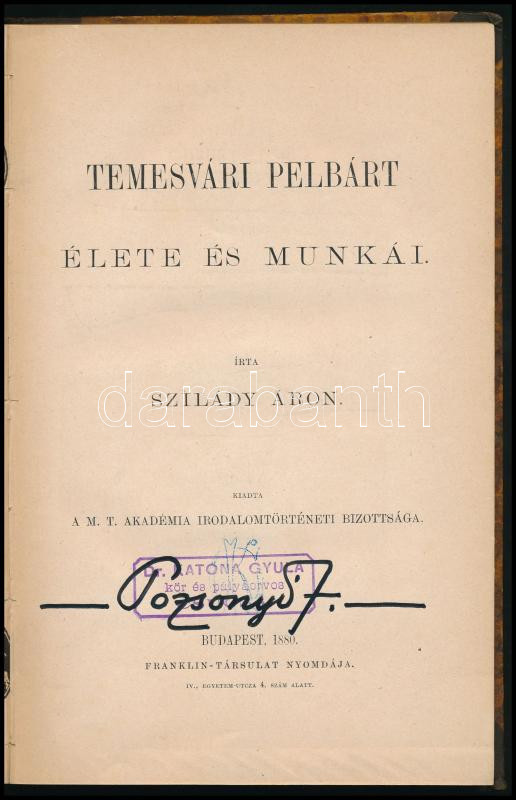 Szilády Áron: Temesvári Pelbárt élete és munkái. Bp., 1880, MTA Irodalomtörténeti Bizottsága (Franklin-ny.), 1 t.+ 135+(1) p. Átkötött félvászon-kötésben, tulajdonosi bélyegzővel és névbejegyzéssel. (Ritka!)