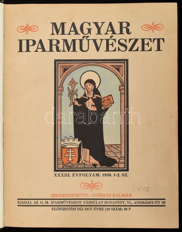 1930 Magyar Iparművészet folyóirat teljes évfolyama: XXXIII. évf. 1-10. sz. Szerk.: Györgyi Kálmán, Czakó Elemér, Szablya-Frischauf Ferenc. Bp., 1930, O. M. Iparművészeti Társulat. Benne többek közt Rosner Károly: A magyar fametszet két évtizede c. írásával; Haranghy Jenő, Kozma Lajos, Dallos Hanna, Jaschik Álmos és mások illusztrációival. Félvászon-kötésben, nagyrészt jó állapotban, ex libris-szel.