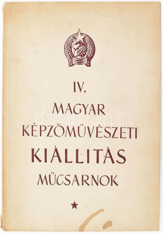 IV. Magyar Képzőművészeti Kiállítás. Bp., 1953, Műcsarnok. Fekete-fehér fotókkal illusztrált, közte Szabó Vladimir, Konecsni György, Ék Sándor, Mácsai István, Csáky-Maronyák József, Domanovszky Endre, Bernáth Aurél, Barcsay Jenő, Würtz Ádám és mások munkáinak fekete-fehér reprodukcióival. Kiadói papírkötés, foltos borítóval, a gerincen kis sérüléssel, a hátsó borítón jegyzettel, címlaphiánnyal.