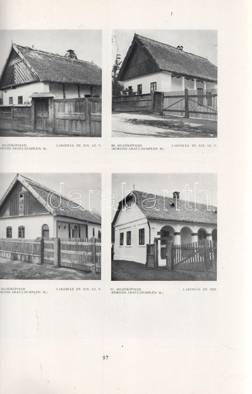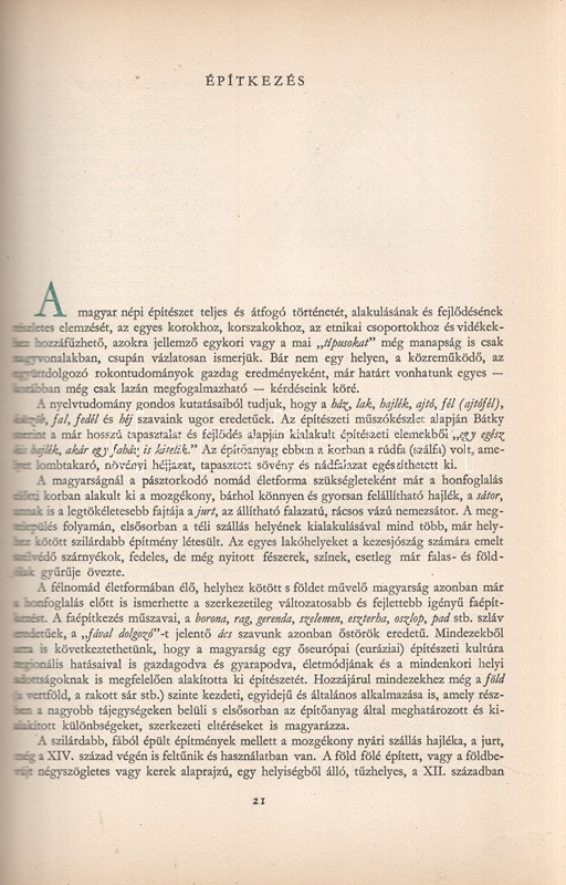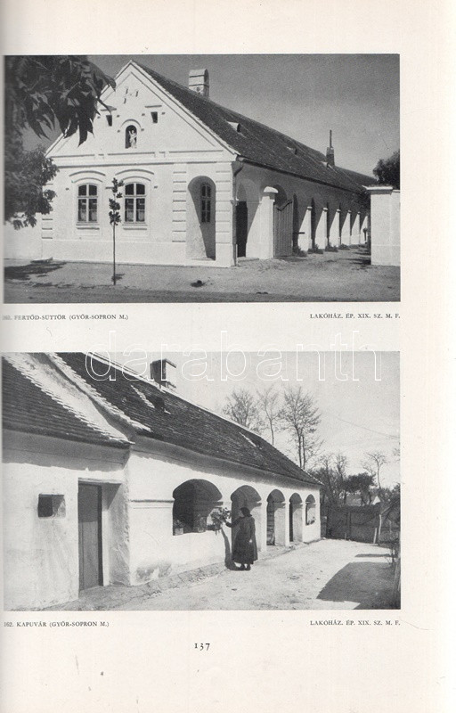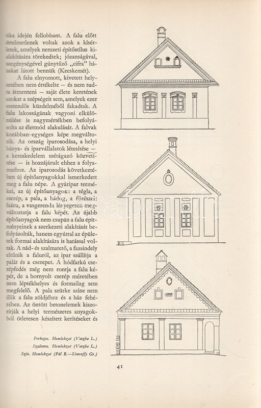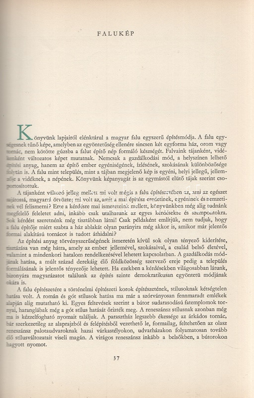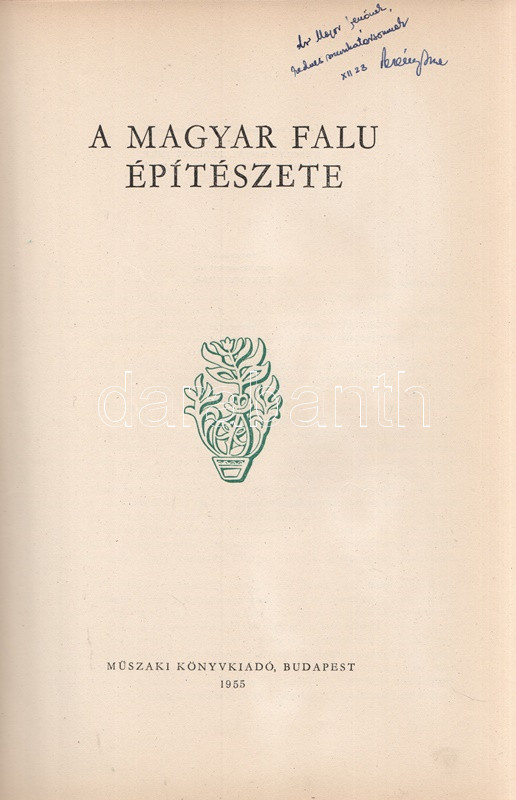 Károlyi Antal - Perényi Imre - Tóth Kálmán - Vargha László (szerk.): A magyar falu építészete. (Dedikált.) Budapest, 1955. Műszaki Könyvkiadó (Budapesti Szikra Nyomda). 202 + [2] p. Egyetlen kiadás. Dedikált: "dr. Major Jenőnek, kedves munkatársamnak: Perényi Imre. XII. 23." A szövegközti térképvázlatokkal, alaprajzokkal, keresztmetszeti ábrákkal, homlokzatrajzokkal gazdagon illusztrált tanulmánykötet a háború utáni Magyarország népi építészeti régióinak formakultúráját tekinti át. A mű településszerkezeti fejezetét Perényi Imre (1913-2002) építész, egyetemi tanár, a Városépítészeti Tanszék vezetője, Budapest főépítésze írta. A szerző későbbi urbanisztikai kötetében is fontos fejezeteket szentel a falusi építészetnek, igaz, ott már nem leíró, hanem előíró módon. Prov.: Major Jenő (1922-1988) településtörténész, földrajztudós, urbanisztikai szakíró. Illusztrált kiadói egészvászon kötésben, színes, illusztrált, enyhén sérült kiadói védőborítóban. Jó példány.