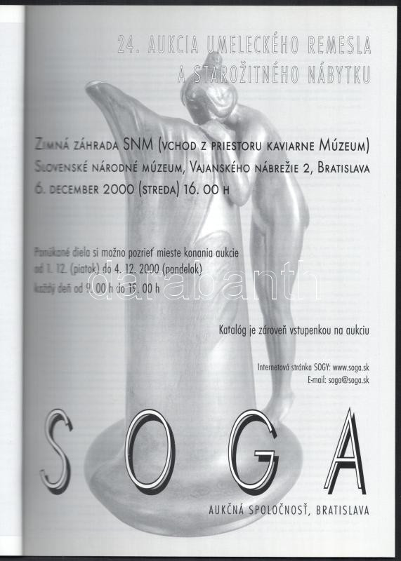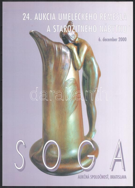 Soga aukciósház 24. árverésének katalógusa, közte Zsolnay szecessziós kerámiával és Ferenc József büsztökkel. Pozsony, 2000, Soga. 42 p. Szlovák nyelven. Kiadói papírkötés.