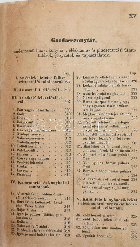 [Németh Zsuzsánna (Wigandné): A legujabb és megpróbált magyar szakácskönyv. Biztos utmutató: mint kelljen 1002 különféle legjobb ízű ételt, süteményt, krémet és kocsonyát, tortát, csemegét és fagylaltokat, legizletesenbb meleg és hideg italokat, gyümölcs csemegét s. a. t. legügyesebben és a? legújabb izlés szerint késziteni. Egy toldalékkal. Melly magában foglalja: Gazdasszonytár, mindennemű ház-, konyha-, éléskamara, s pinczetartási utmutatások, jegyzetek és tapasztalások; tovább: az étkek ízletes felkészítéséről; az asztal teritéséről; az asztal teritéséről; az étkek felszeldeléséről s. a. t. A magyar házi asszonyok számára készitette - -. Pest, 1853., Heckenast Gusztáv], XV-XVI, 3-347 p. Átkötött modern egészvászon-kötésben, néhány restaurált lappal, az elején hiánnyal, közte címlap hiánnyal (csak XV/XVI lap), de maga a szövegrész hiánytalan.