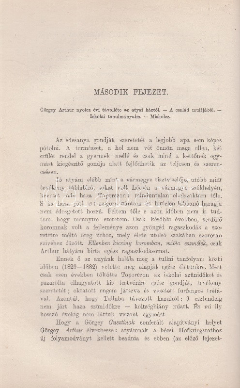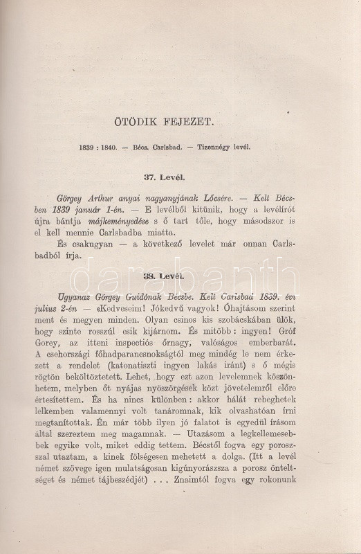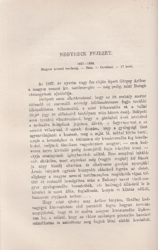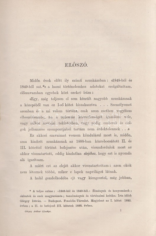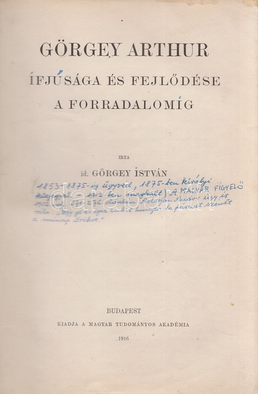 Görgey István: Görgey Arthur ifjúsága és fejlődése a forradalomig. Budapest, 1916. Magyar Tudományos Akadémia (Franklin-Társulat ny.) VIII + 454 p. Egyetlen kiadás. Görgey István (1825-1912) ügyvéd, királyi főjegyző életrajza bátyjáról, Görgei Artúr (1818-1916) honvéd tábornokról, vegyészről. A beszámoló a gyermekkortól a szabadságharc időszakáig tekinti át az életet, családi levelek, okiratok alapján. A címlapon régi kézírásos jegyzet. Sérült gerincű korabeli félvászon kötésben, az első kötéstábla felső sarkán apró hiánnyal, színes festésű lapszélekkel.
