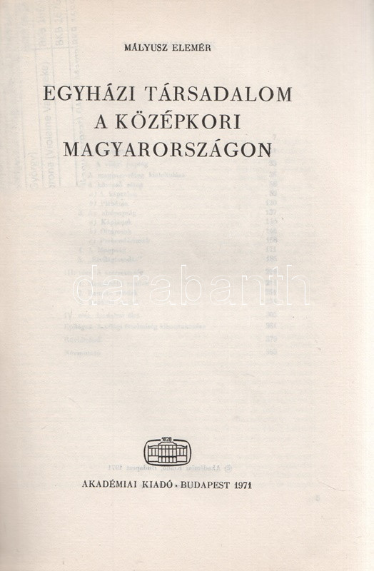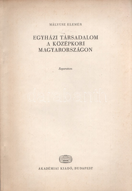 Mályusz Elemér: Egyházi társadalom a középkori Magyarországon. [Különlenyomat.] (Dedikált.) Budapest, 1971. Akadémiai Kiadó [Akadémiai Nyomda]. 16 p. Dedikált: "Major Jenőnek, megemlékezését utólag is hálásan megköszönve és a legjobbakat kívánva, köszönettel: Mályusz Elemér". Mályusz Elemér (1898-1989) történész, középkorász, szerkesztő, levéltáros, a magyar középkor egyik legjobb ismerője. Különlenyomatunk az először 1971-ben megjelent, összesen 398 oldal terjedelmű monográfiának csupán első ívét tartalmazza. Prov.: Major Jenő (1922-1988) településtörténész, földrajztudós, urbanisztikai szakíró. Fűzve, kiadói borítóban. Jó példány. Különlenyomatként igen ritka.