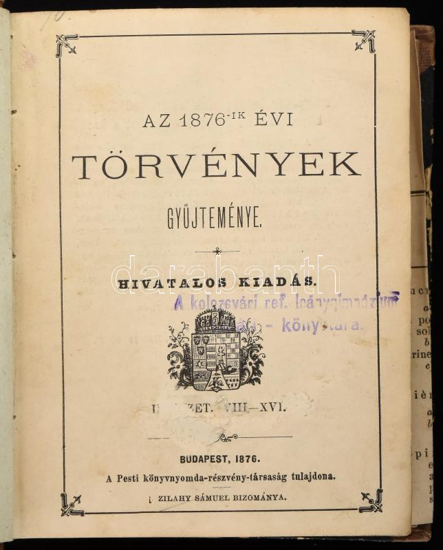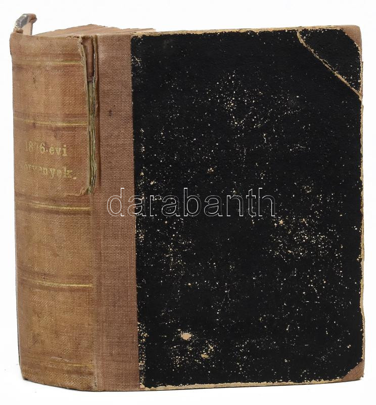 Az 1876-ik évi törvények gyűjteménye. Hivatalos kiadás. Bp., 1876, Pesti Könyvnyomda Rt., 720 p.+ 3 (kihajtható, kétoldalas) t. Első kiadás. Átkötött félvászon-kötésben, kopottas borítóval, a gerincen sérüléssel, kissé sérült címlappal, részben hullámos lapokkal, ázásnyomokkal, régi intézményi bélyegzőkkel.