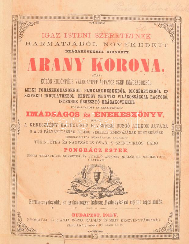 Pongrácz Eszter: Igaz isteni szeretetnek harmatjából növekedett drága kövekkel kirakott Arany Korona. Azaz: külön-különféle válogatott ájtatos szép imádságokból, lelki foghászokból [...] drágakövekkel formáltatott és készítettetett imádságos és énekes könyv... Bp.,1911., Rózsa Kálmán, 8+460+IV p. Átkötött modern aranyozott egészvászon-kötés, kopott borítóval, javított, restaurált, részben pótolt lapokkal, hiányzó címképpel, bejegyzéssel.
