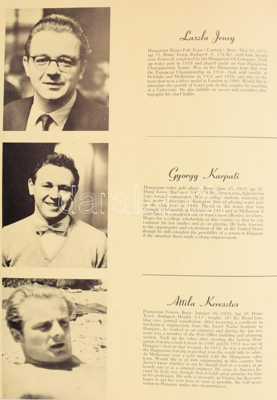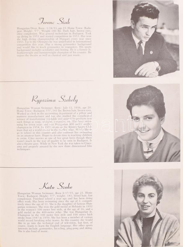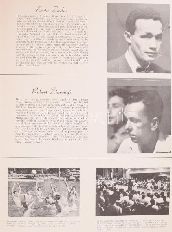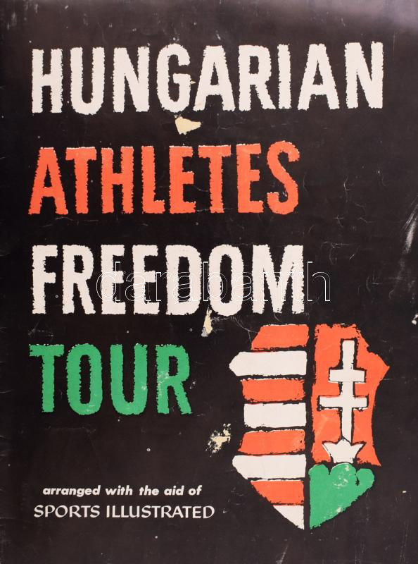 Hungarian Athletes Freedom Tour. Arranged with the aid of Sports Illustrated. New York, 1956., Sports Illustated, 8 sztl. Gazdag fekete-fehér képanyaggal illusztrált. Angol nyelven. Benne magyar olimpikonokkal és edzőkkel, az 1956-os Melbournei olimpia magyar hőseivel: Bodó Andrea, Bordi János, Deutsch József, Dobay Gyula, Domján Árpád, Domolky Lidia, Gergely János, Gerlach József, Gróf Ödön, Gyarmaty Olga, Hámori Jenő, Hernek István, Hoszpodár Zoltán, Iglói Mihály, Jekelfalussy-Piller György, Jeney László, Kárpáti György, Keresztes Attila, Korondi Mária, Magay Dániel, Magyar László, Martin Miklós, Molnár Miklós, Nádori László, Nagy Gábor, Nagy Márta, Ördög Zsuzsa, Papp Bálint, Kerrich Bála, Sakovits József, Siak Ferenc, Székely Ripszima, Szőke Kató, Tábori László, Jakach Attila, Dr. Török Zoltán , Zádor Ervin, Zimonyi Robert. Kiadói papírkötés. Rendkívül ritka!