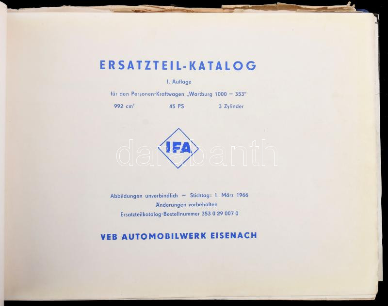 Beschreibung: Wartburg 1000 - 353. Ersatzteil - Katalog. I. Auflage für den Personen-Kraftwagen "Wartburg 1000-353." Eisenach, 1966., VEB Automobilwerk. IFA. Kiadói haránt-alakú nylon-kötés, jegyzetlapokkal.
