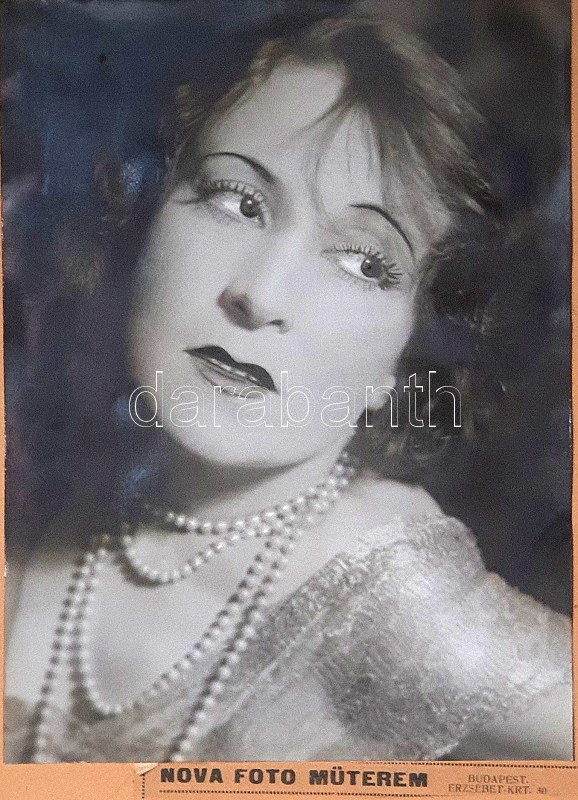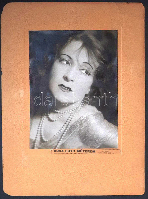 Makay Margit (1891-1989) színművésznő portréja. A Nova Foto Műterem felvétele. (1938 körül) Vintázs, zselatinos ezüst nagyítás, retusált. Mérete: 233x174 mm, egy 382x280 mm-es méretű fotókartonon. A fotó alatt a műterem megnevezése, hátoldalán a felvétel készülésének feltételezhető dátuma. Jó állapotú fotó, enyhén sérült fotókartonon. Ritka felvétel.