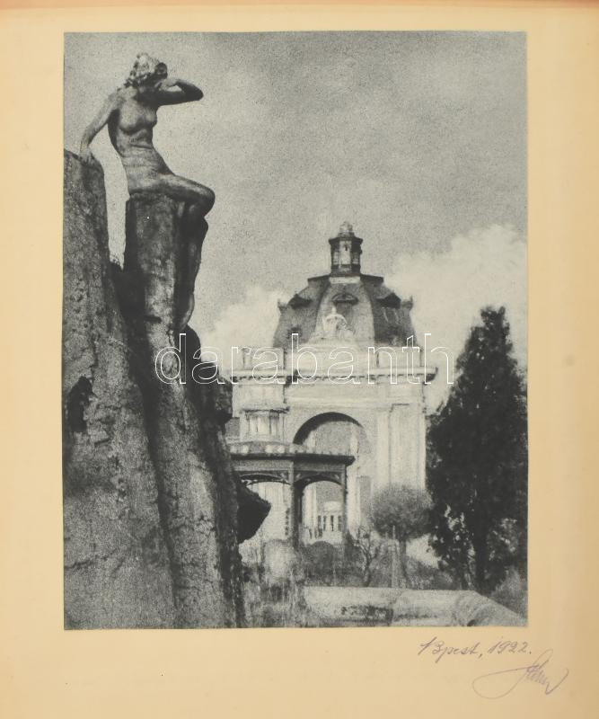 Schermann József az 1920. október 30. és november 15. között az Iparművészeti Múzeumban rendezett III. művészi fényképkiállítás résztvevője: Ligeti szőlő. Jelzett, vintage fotóművészeti alkotás, kiállítási számmal. Br. olajnyomás. Kartonon. Hátodalán autográf felirattal Teljes méret 25x31 cm