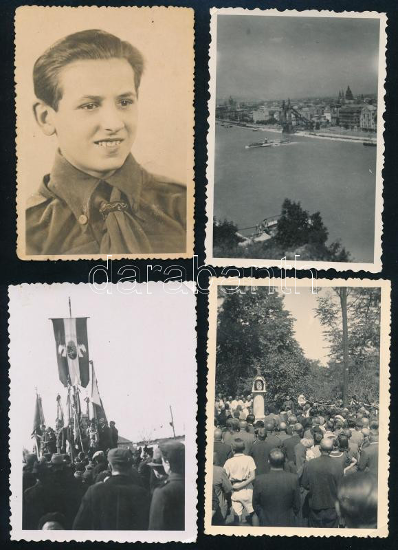 cca 1930-1952 4 db fotó: cserkészportré, országzászló-avatás, lengyel emlékmű leleplezése, a felrobbantott Erzsébet híd pesti hídfője; a hátoldalon részben feliratozva, 9x6 cm körüli méretben