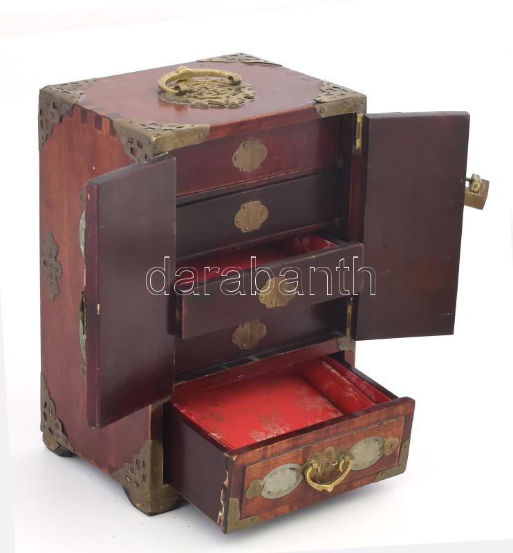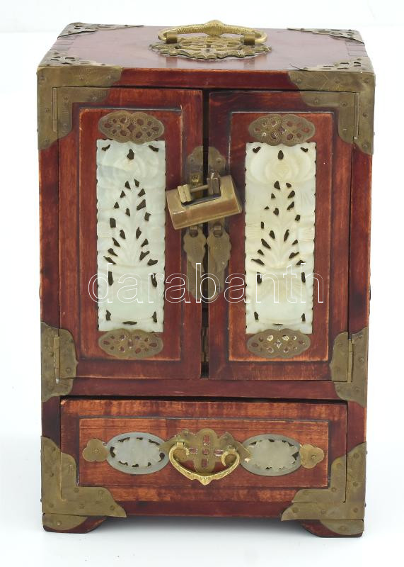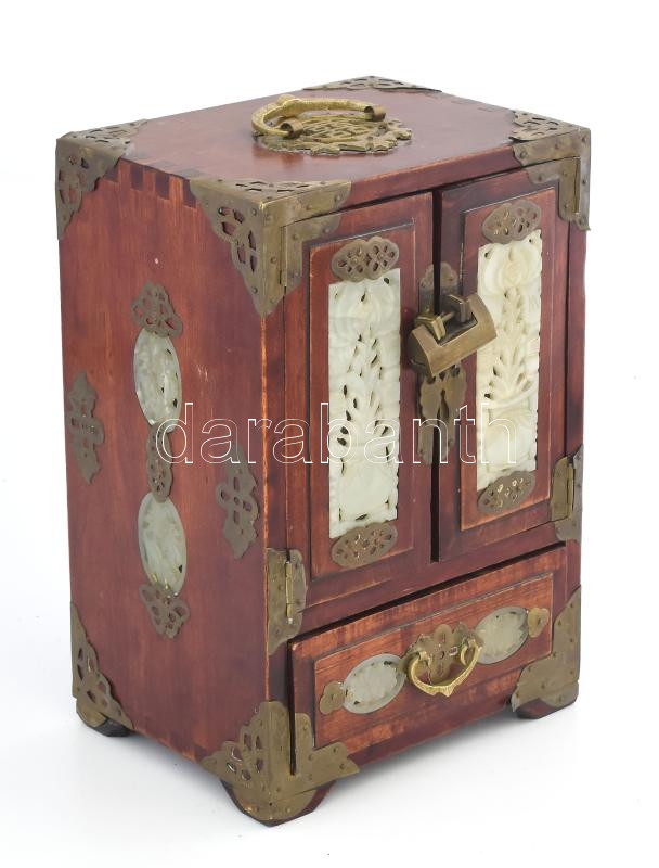 Beschreibung: Kínai ékszeres asztali szekrény, sárgaréz veretekkel és faragott gyöngyház tábla berakásokkal, benne a tradicionális zárszerkezettel ,28x19 cm