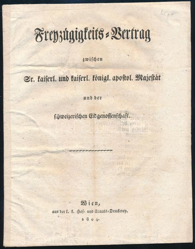 1804 Bécs, Freizügigkeits-Vertrag - szabad költözködési szerződés a cs... https://www.darabanth.com/de/480-Fernauktion/480.0/Kunst-Dokumente-andere-Sammelgebiete/Drucksachen~1500018/1804-Becs-Freizugigkeits-Vertrag-szabad-koltozkodesi-szerzodes-a-csaszar-es-Svajc-kozott-5p~II3275485