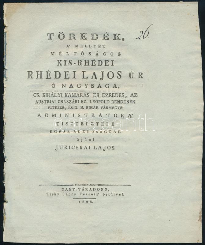 1808 Nagyvárad, Töredék, a' mellyet méltóságos Kis-Rhédei Rhédei Lajos... https://www.darabanth.com/de/480-Fernauktion/480.0/Kunst-Dokumente-andere-Sammelgebiete/Drucksachen~1500018/1808-Nagyvarad-Toredek-a-mellyet-meltosagos-Kis-Rhedei-Rhedei-Lajos-ur-o-nagysaga-8p~II3276823