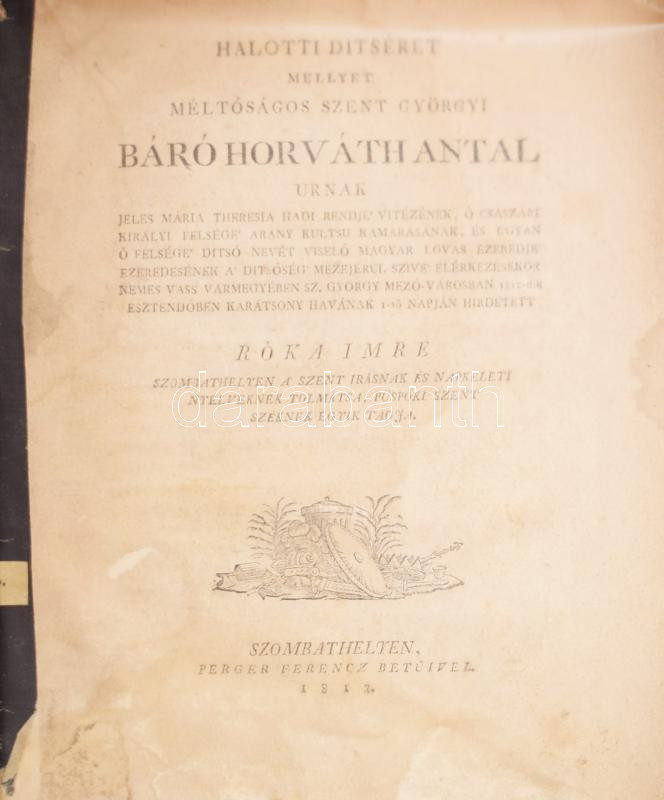 1812 Halotti dítséret mellyet méltóságos szent györgyi báró Horváth Antal urnak ... Róka Imre Szombathelyen a Szent Írásnak és napkeleti nyelveknek tolmátsa. püspöki szent széknek egyik tagja. Szombathely., 1812. Perger Ferenc. 23 p.