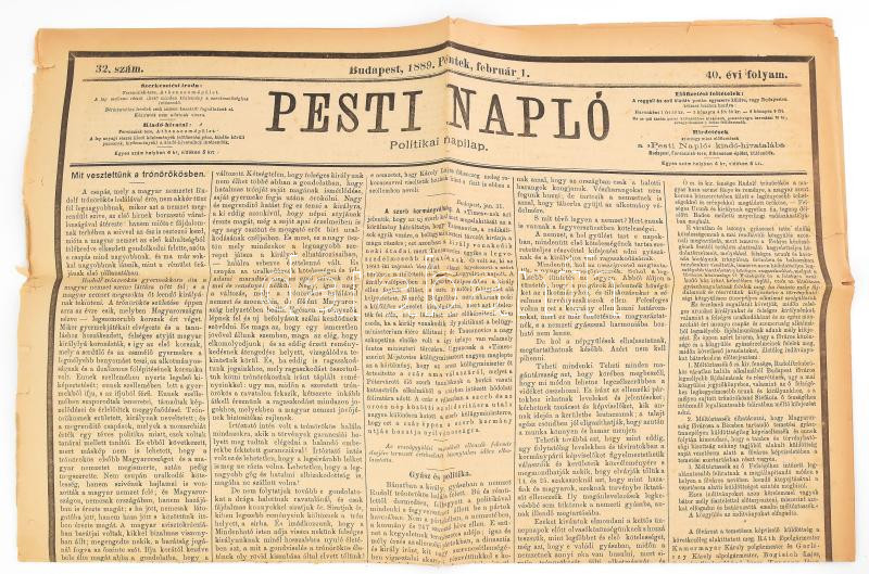 1889 Pesti Napló 40. évf 32. szám Rudolf trónörökös halálhírével és kö... https://www.darabanth.com/de/480-Fernauktion/480.0/Kunst-Dokumente-andere-Sammelgebiete/Drucksachen~1500018/1889-Pesti-Naplo-40-evf-32-szam-Rudolf-tronorokos-halalhirevel-es-kovetkezmenyeinek-taglallasaval~II3277296