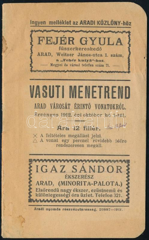 1912 Vasúti menetrend az Arad városát érintő vonatokról, 31p https://www.darabanth.com/de/480-Fernauktion/480.0/Kunst-Dokumente-andere-Sammelgebiete/Drucksachen~1500018/1912-Vasuti-menetrend-az-Arad-varosat-erinto-vonatokrol-31p~II3277203