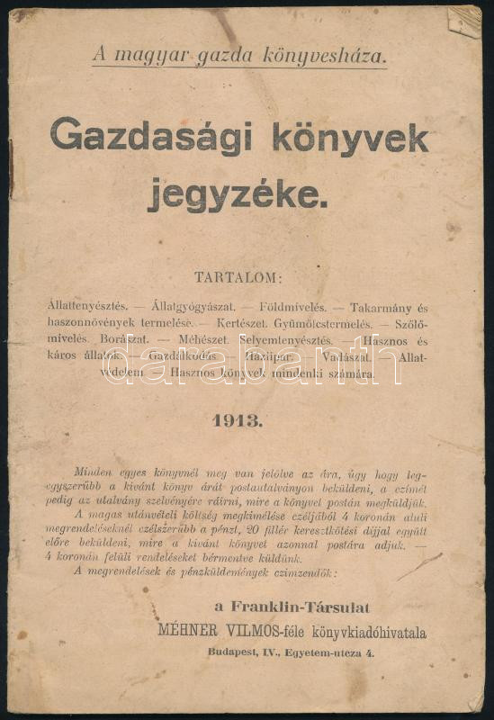 1913 A magyar gazda könyvesháza - Gazdasági könyvek jegyzéke. Bp., Fra... https://www.darabanth.com/de/480-Fernauktion/480.0/Kunst-Dokumente-andere-Sammelgebiete/Drucksachen~1500018/1913-A-magyar-gazda-konyveshaza-Gazdasagi-konyvek-jegyzeke-Bp-Franklin-ny-Tuzott-papirkotes-~II3233832