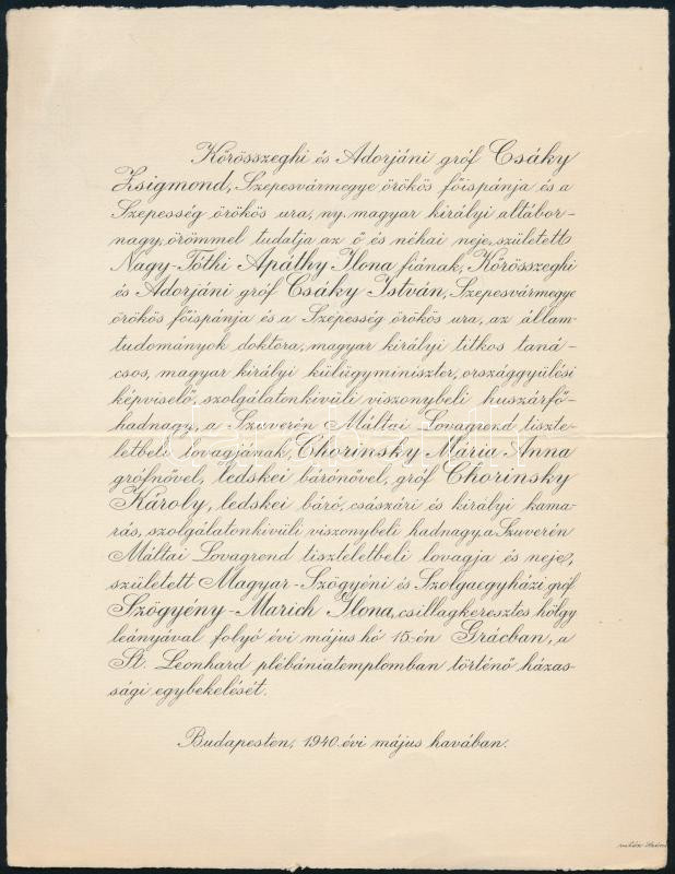 1940 Bp., gróf körösszeghi és adorjáni Csáky István (1894-1941) politi... https://www.darabanth.com/de/480-Fernauktion/480.0/Kunst-Dokumente-andere-Sammelgebiete/Drucksachen~1500018/1940-Bp-grof-korosszeghi-es-adorjani-Csaky-Istvan-1894-1941-politikus-kulugyminiszter-eskuvoi~II3276071