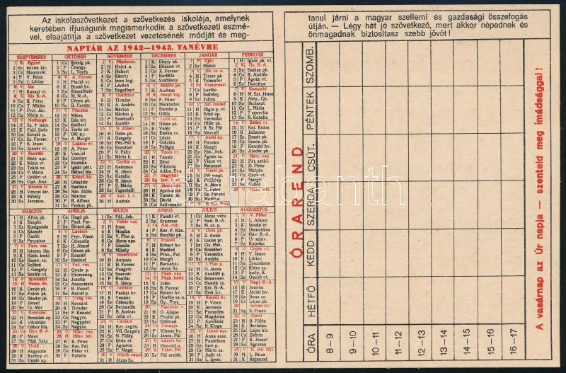 1942 Iskolaszövetkezeti naptár-órarend az 1942-1943. tanévre https://www.darabanth.com/de/480-Fernauktion/480.0/Kunst-Dokumente-andere-Sammelgebiete/Drucksachen~1500018/1942-Iskolaszovetkezeti-naptar-orarend-az-1942-1943-tanevre~II3257664