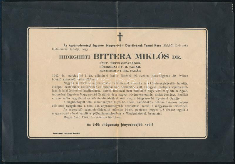 1947 hideghéti Bittera Miklós (1887-1947) szkv. repülőszázados, főiskolai és egyetemi tanár, növénytermesztő, szakíró, a Magyar Felsőház tagja (1939-1945) gyászjelentése