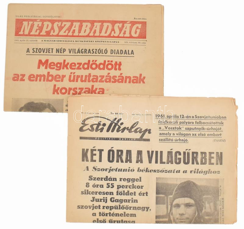 1961 Jurij Gagarin űrrepüléséről beszámoló újságok, 2 db: Népszabadság... https://www.darabanth.com/de/480-Fernauktion/480.0/Kunst-Dokumente-andere-Sammelgebiete/Drucksachen~1500018/1961-Jurij-Gagarin-urrepuleserol-beszamolo-ujsagok-2-db-Nepszabadsag-1961-apr-13-i-szama-plus~II3277126
