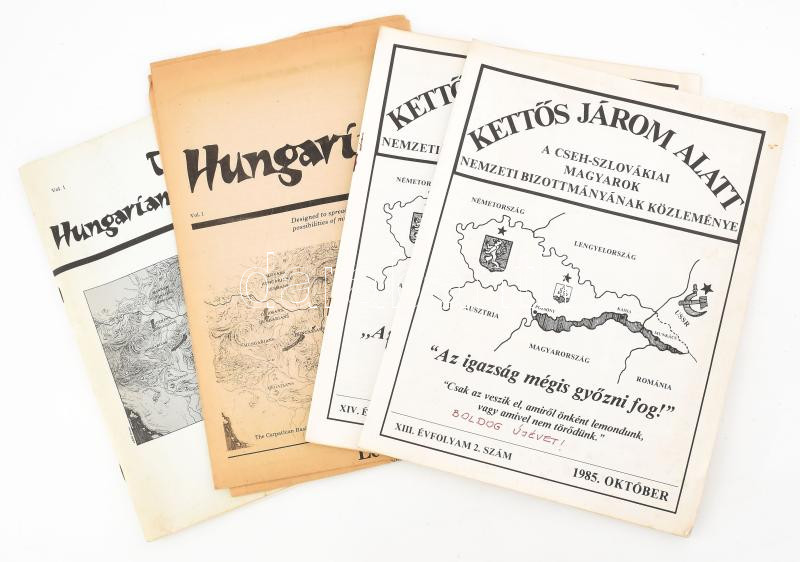 1985-1986 Kárpát-medencei, határontúli magyarsággal foglalkozó emigráns kiadványok, 4 db: Kettős járom alatt. A cseh-szlovákiai magyarok Nemzeti Bizottmányának időszaki kiadványa. XIII. évf. 2. sz. és XIV. évf. 1. sz. + The Hungarian Quarterly Vol. 1. No. 2. & No. 3. (angol nyelvű). Vegyes állapotban.