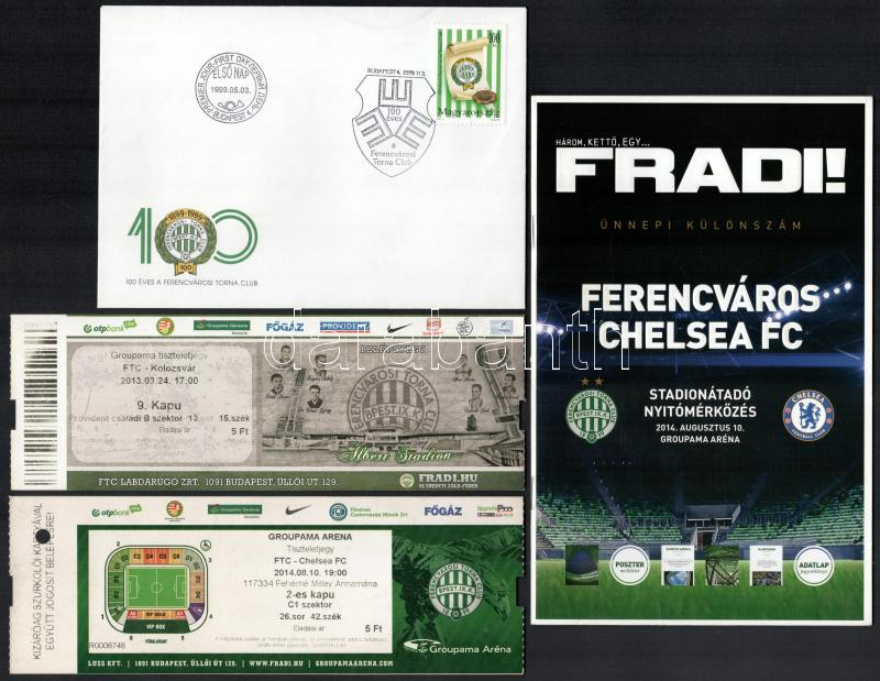 Fradi tétel, 4 db: 2014 Ferencváros - Chelsea FC stadionátadó nyitómérkőzés különszám és belépőjegy + 2013 FTC - Kolozsvár mérkőzés belépőjegy + 1999 "100 éves a Ferencvárosi Torna Club" FDC