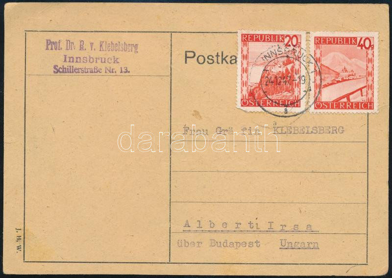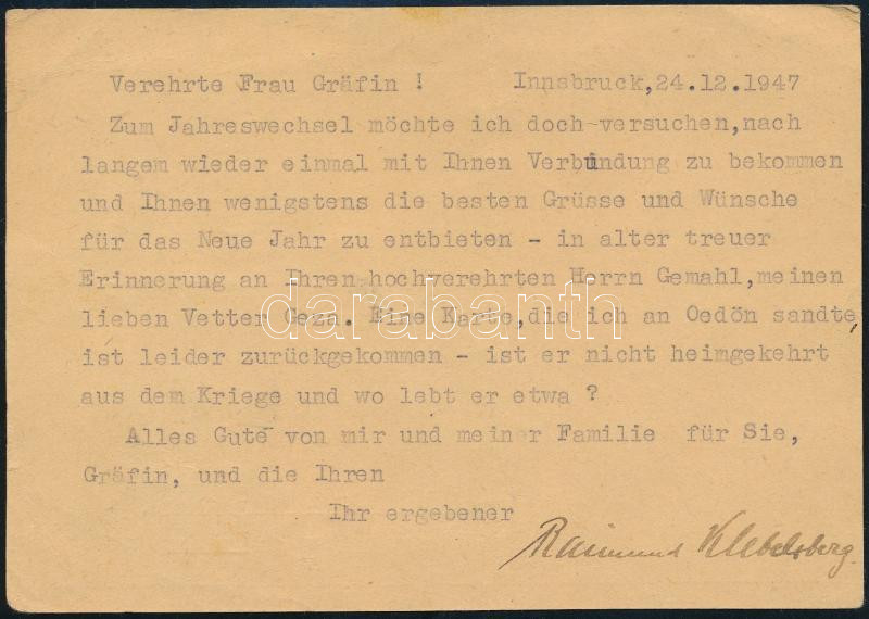 Beschreibung: 1947 Raimund Klebelsberg (1886-1967) osztrák geológus gépelt levelezőlapja Albertirsára, Klebelsberg grófnéhez, autográf aláírásával.