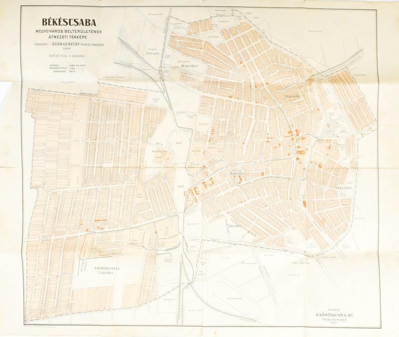 1930 Békéscsaba megyei város belterületének átnézeti térképe, tervezte: Ádám Gusztáv, 1:10 000, kiadja: Körösvidék Rt., kissé foltos, szakadásokkal, a szélén a térképet nem érintő hiánnyal, 50×59 cm