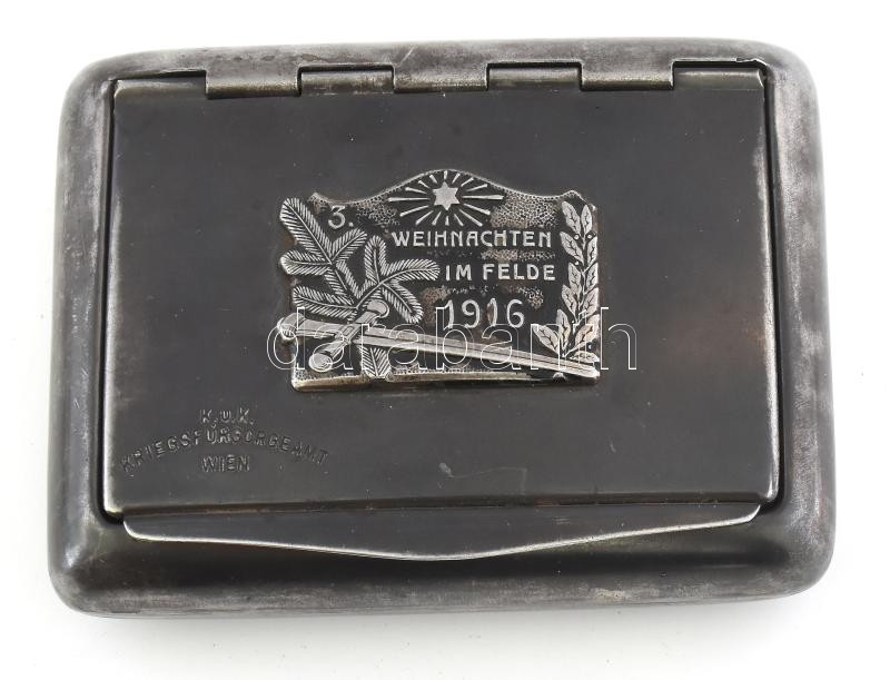 I. világháborús ezüstözött fém cigarettatárca, fedelén "3. Weihnachten im Felde 1916" (3. Karácsony a harctéren 1916.) jelvénnyel, "K. u. K. Kriegsfürsorgeamt Wien" (Cs. és kir. Hadsegélyező Hivatal, Bécs) jelzéssel. Megkímélt, jó állapotban, 9,5x6,5x2 cm