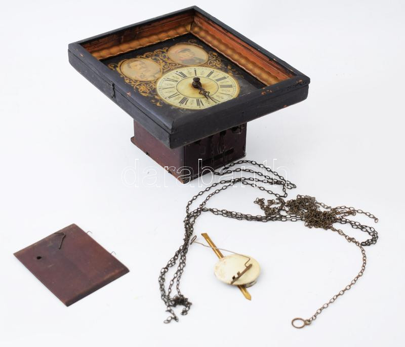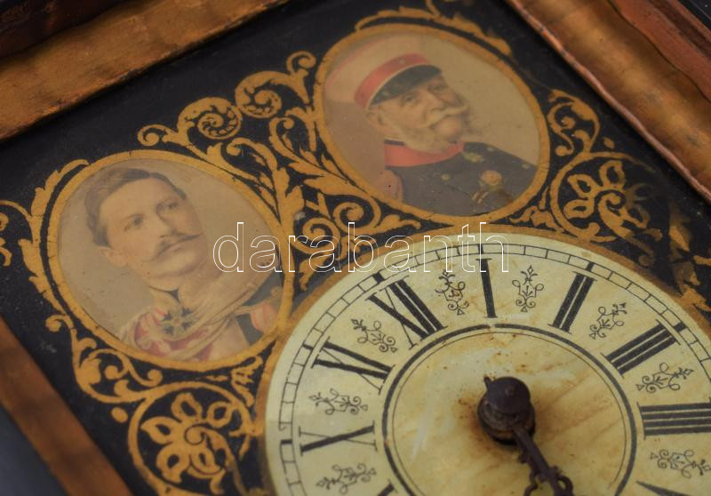 Beschreibung: cca 1870 Német falióra. Vilmos császár és és apja portréjával. Feles ütős, ingajáratos, réz súlyokkal, sérült, nem müködő állapotban 22x26 cm