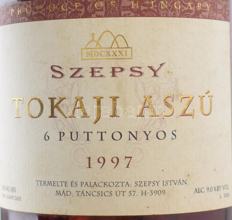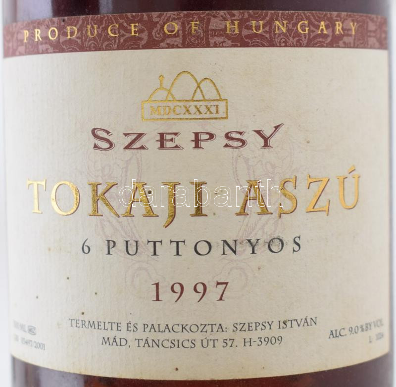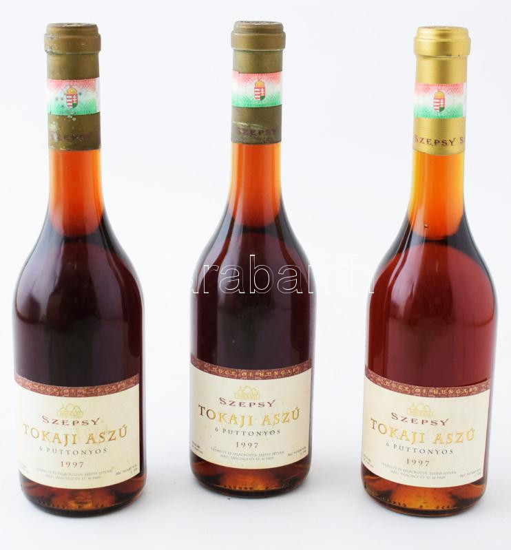 1997 Szepsy 6 puttonyos tokaji aszú, 3 bontatlan palack édes fehér des... https://www.darabanth.com/de/480-Fernauktion/480.0/Kunst-Dokumente-andere-Sammelgebiete/Vintage-Weine-Getranke~500017/1997-Szepsy-6-puttonyos-tokaji-aszu-3-bontatlan-palack-edes-feher-desszertbor-9-0-5l~II3268494